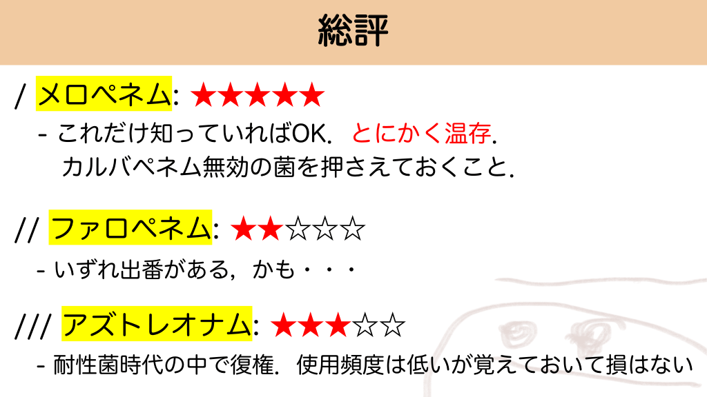 #22. 総評 / メロぺネム: ★★★★★ - これだけ知っていればOK.とにかく温存. カルバペネム無効の菌を押さえておくこと. // ファロペネム: ★★☆☆☆ - いずれ出番がある,かも・・・ /// アズトレオナム: ★★★☆☆ - 耐性菌時代の中で復権.使用頻度は低いが覚えておいて損はない