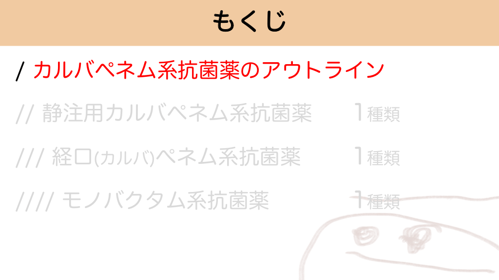#3. もくじ / カルバペネム系抗菌薬のアウトライン // 静注用カルバペネム系抗菌薬 1種類 /// 経口(カルバ)ぺネム系抗菌薬 1種類 //// モノバクタム系抗菌薬 1種類