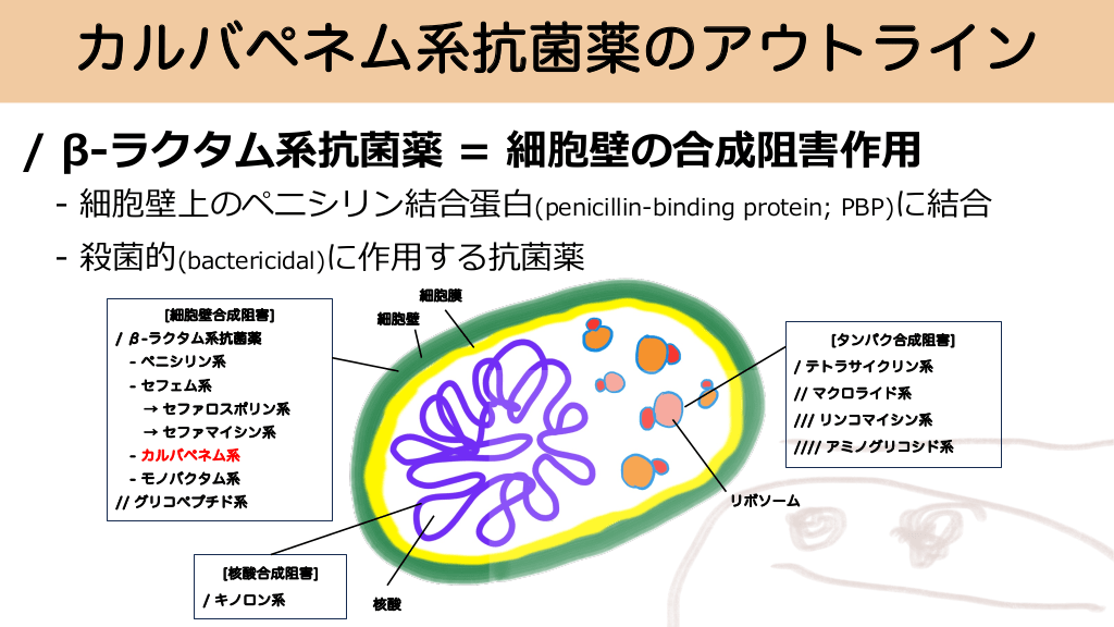 #5. カルバペネム系抗菌薬のアウトライン / β-ラクタム系抗菌薬 = 細胞壁の合成阻害作⽤ - 細胞壁上のペニシリン結合蛋⽩(penicillin-binding protein; PBP)に結合 - 殺菌的(bactericidal)に作⽤する抗菌薬 細胞膜 [細胞壁合成阻害] 細胞壁 / β-ラクタム系抗菌薬 [タンパク合成阻害] - ペニシリン系 / テトラサイクリン系 - セフェム系 // マクロライド系 → セファロスポリン系 /// リンコマイシン系 → セファマイシン系 //// アミノグリコシド系 - カルバペネム系 - モノバクタム系 リボソーム // グリコペプチド系 [核酸合成阻害] / キノロン系 核酸