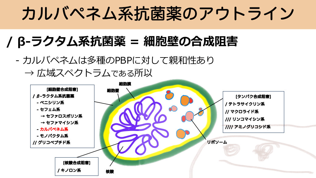 #6. カルバペネム系抗菌薬のアウトライン / β-ラクタム系抗菌薬 = 細胞壁の合成阻害 - カルバペネムは多種のPBPに対して親和性あり → 広域スペクトラムである所以 細胞膜 [細胞壁合成阻害] 細胞壁 / β-ラクタム系抗菌薬 [タンパク合成阻害] - ペニシリン系 / テトラサイクリン系 - セフェム系 // マクロライド系 → セファロスポリン系 /// リンコマイシン系 → セファマイシン系 //// アミノグリコシド系 - カルバペネム系 - モノバクタム系 リボソーム // グリコペプチド系 [核酸合成阻害] / キノロン系 核酸