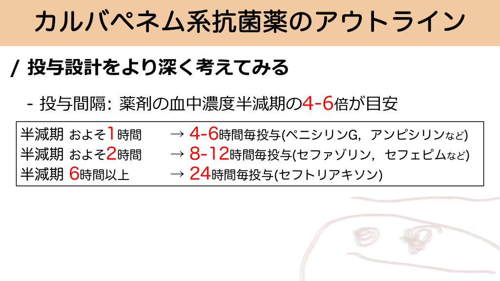 #7. カルバペネム系抗菌薬のアウトライン / 投与設計をより深く考えてみる - 投与間隔: 薬剤の⾎中濃度半減期の4-6倍が⽬安 半減期 およそ1時間 半減期 およそ2時間 半減期 6時間以上 → 4-6時間毎投与(ペニシリンG,アンピシリンなど) → 8-12時間毎投与(セファゾリン,セフェピムなど) → 24時間毎投与(セフトリアキソン)