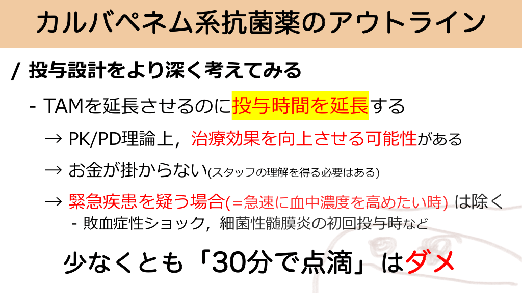 #8. カルバペネム系抗菌薬のアウトライン / 投与設計をより深く考えてみる - TAMを延⻑させるのに投与時間を延⻑する → PK/PD理論上,治療効果を向上させる可能性がある → お⾦が掛からない(スタッフの理解を得る必要はある) → 緊急疾患を疑う場合(=急速に⾎中濃度を⾼めたい時) は除く - 敗⾎症性ショック,細菌性髄膜炎の初回投与時など 少なくとも「30分で点滴」はダメ