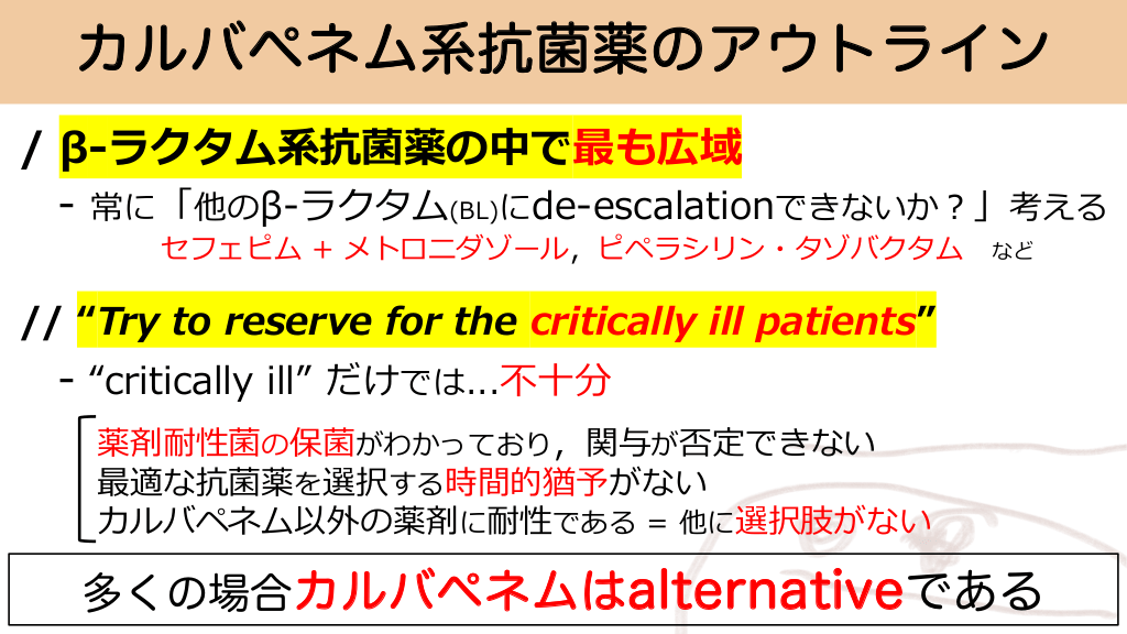 #9. カルバペネム系抗菌薬のアウトライン / β-ラクタム系抗菌薬の中で最も広域 - 常に「他のβ-ラクタム(BL)にde-escalationできないか︖」考える セフェピム + メトロニダゾール,ピペラシリン・タゾバクタム など // “Try to reserve for the critically ill patients” - “critically ill” だけでは...不⼗分 薬剤耐性菌の保菌がわかっており,関与が否定できない 最適な抗菌薬を選択する時間的猶予がない カルバペネム以外の薬剤に耐性である = 他に選択肢がない 多くの場合カルバペネムはalternativeである