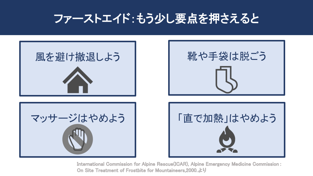 #10. ファーストエイド:もう少し要点を押さえると 風を避け撤退しよう 靴や手袋は脱ごう マッサージはやめよう 「直で加熱」はやめよう International Commission for Alpine Rescue(ICAR), Alpine Emergency Medicine Commission: On Site Treatment of Frostbite for Mountaineers,2000.より