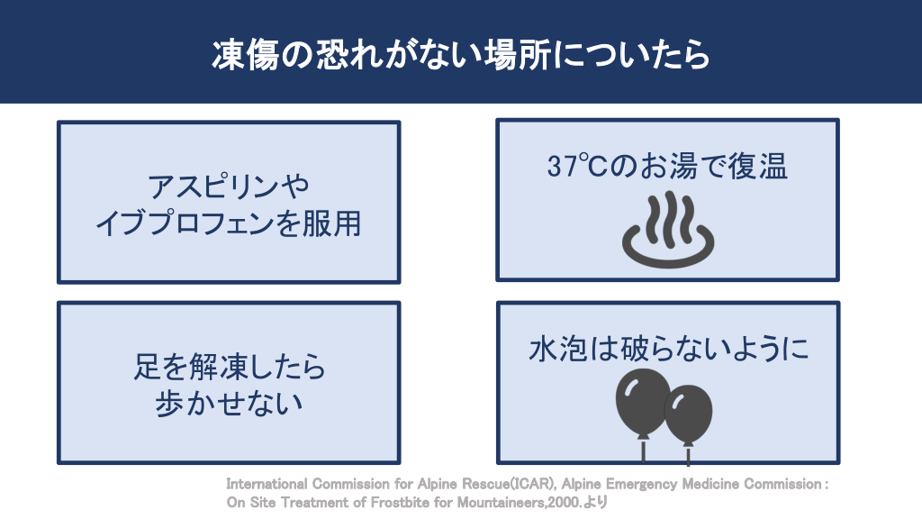 #11. 凍傷の恐れがない場所についたら アスピリンや イブプロフェンを服用 足を解凍したら 歩かせない 37℃のお湯で復温 水泡は破らないように International Commission for Alpine Rescue(ICAR), Alpine Emergency Medicine Commission: On Site Treatment of Frostbite for Mountaineers,2000.より