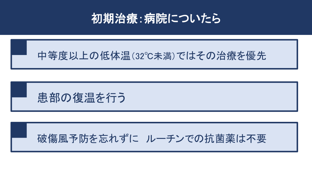 #12. 初期治療:病院についたら 中等度以上の低体温(32℃未満)ではその治療を優先 患部の復温を行う 破傷風予防を忘れずに ルーチンでの抗菌薬は不要