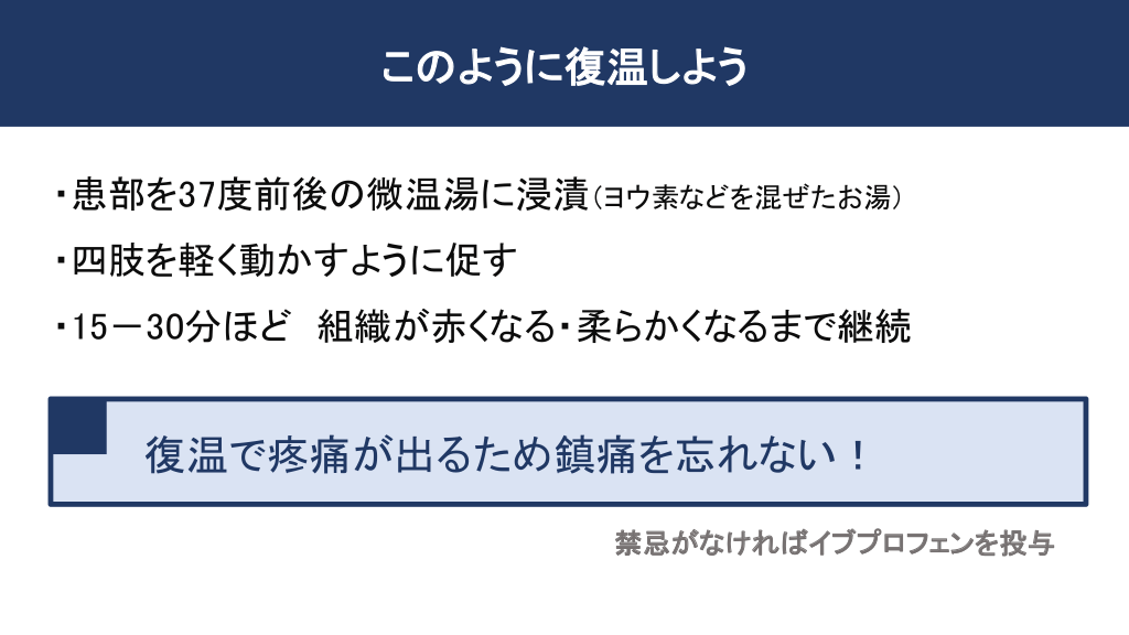 #13. このように復温しよう ・患部を37度前後の微温湯に浸漬(ヨウ素などを混ぜたお湯) ・四肢を軽く動かすように促す ・15-30分ほど 組織が赤くなる・柔らかくなるまで継続 復温で疼痛が出るため鎮痛を忘れない! 禁忌がなければイブプロフェンを投与