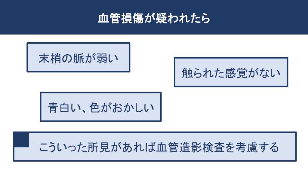 #14. 血管損傷が疑われたら 末梢の脈が弱い 触られた感覚がない 青白い、色がおかしい こういった所見があれば血管造影検査を考慮する