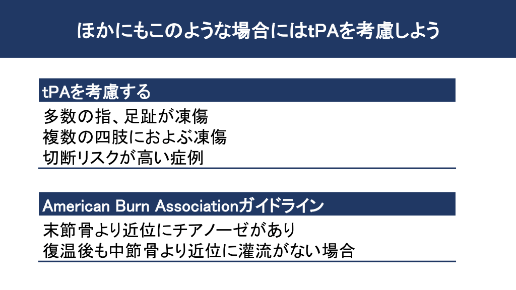 #17. ほかにもこのような場合にはtPAを考慮しよう tPAを考慮する 多数の指、足趾が凍傷 複数の四肢におよぶ凍傷 切断リスクが高い症例 American Burn Associationガイドライン 末節骨より近位にチアノーゼがあり 復温後も中節骨より近位に灌流がない場合