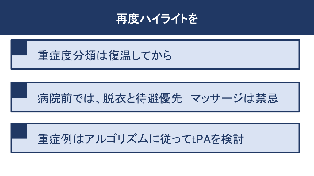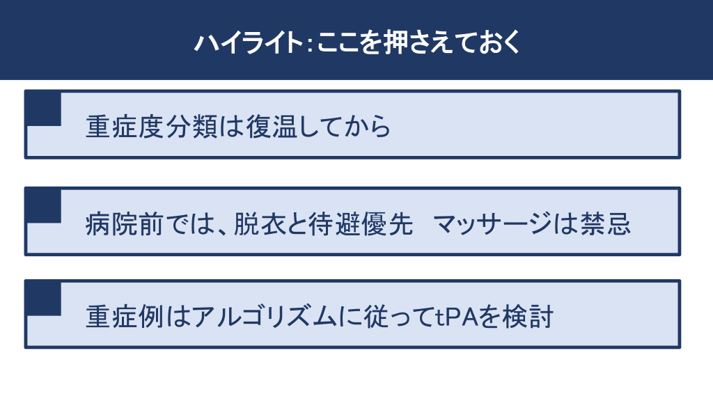 #3. ハイライト:ここを押さえておく 重症度分類は復温してから 病院前では、脱衣と待避優先 マッサージは禁忌 重症例はアルゴリズムに従ってtPAを検討
