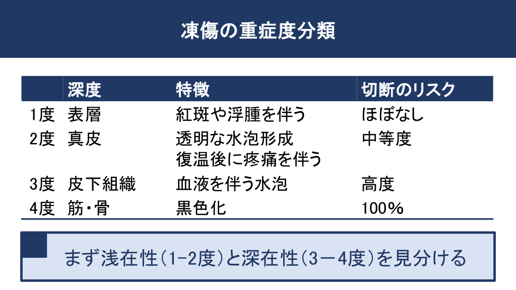 #6. 凍傷の重症度分類 深度 1度 表層 2度 真皮 3度 皮下組織 4度 筋・骨 特徴 紅斑や浮腫を伴う 透明な水泡形成 復温後に疼痛を伴う 血液を伴う水泡 黒色化 切断のリスク ほぼなし 中等度 高度 100% まず浅在性(1-2度)と深在性(3-4度)を見分ける