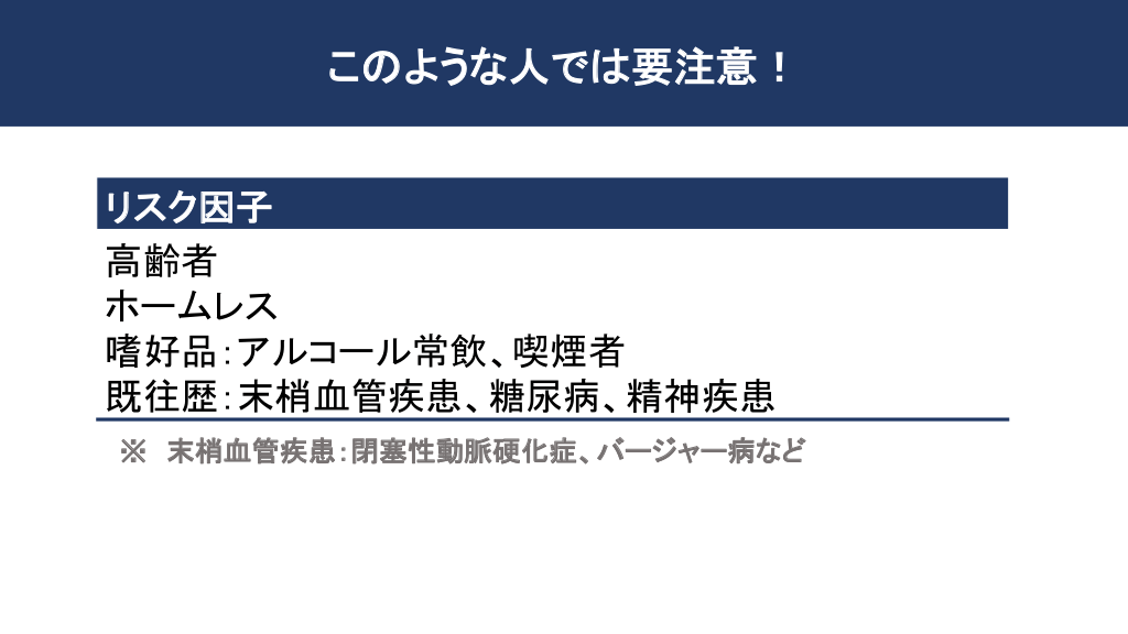 #8. このような人では要注意! リスク因子 高齢者 ホームレス 嗜好品:アルコール常飲、喫煙者 既往歴:末梢血管疾患、糖尿病、精神疾患 ※ 末梢血管疾患:閉塞性動脈硬化症、バージャー病など