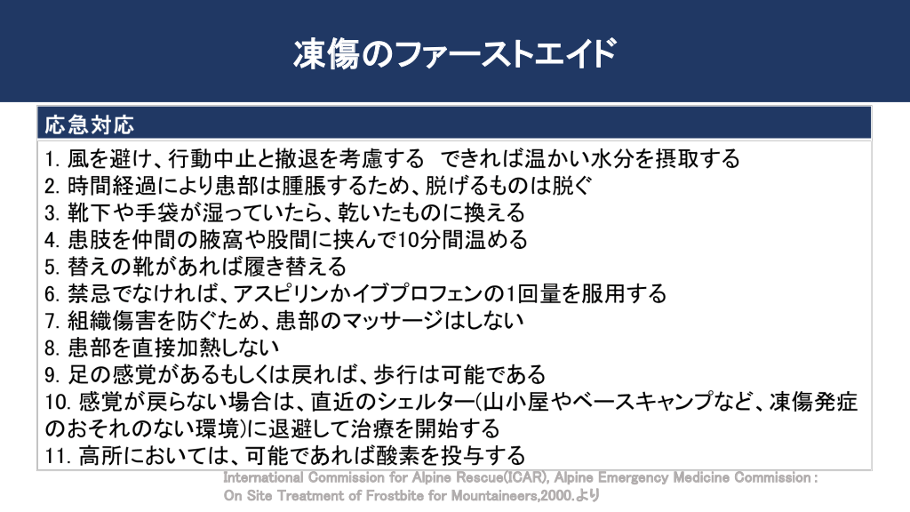 #9. 凍傷のファーストエイド International Commission for Alpine Rescue(ICAR), Alpine Emergency Medicine Commission: On Site Treatment of Frostbite for Mountaineers,2000.より