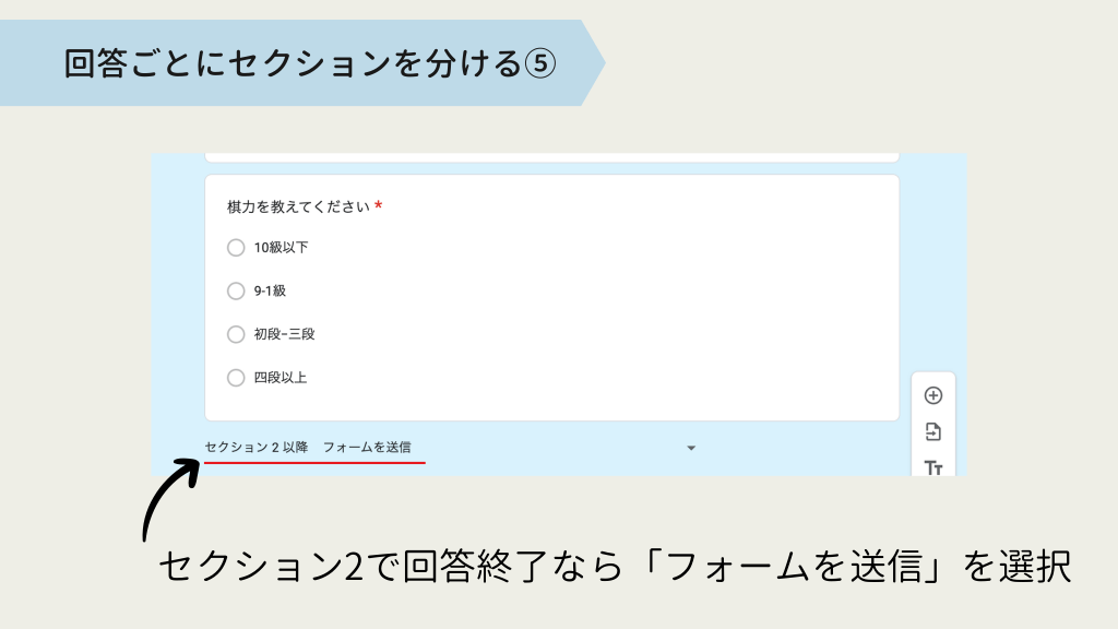 #10. 回答ごとにセクションを分ける⑤ セクション2で回答終了なら「フォームを送信」を選択