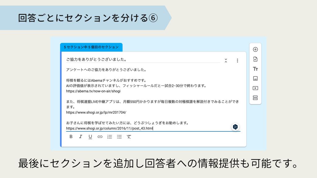 #11. 回答ごとにセクションを分ける⑥ 最後にセクションを追加し回答者への情報提供も可能です。