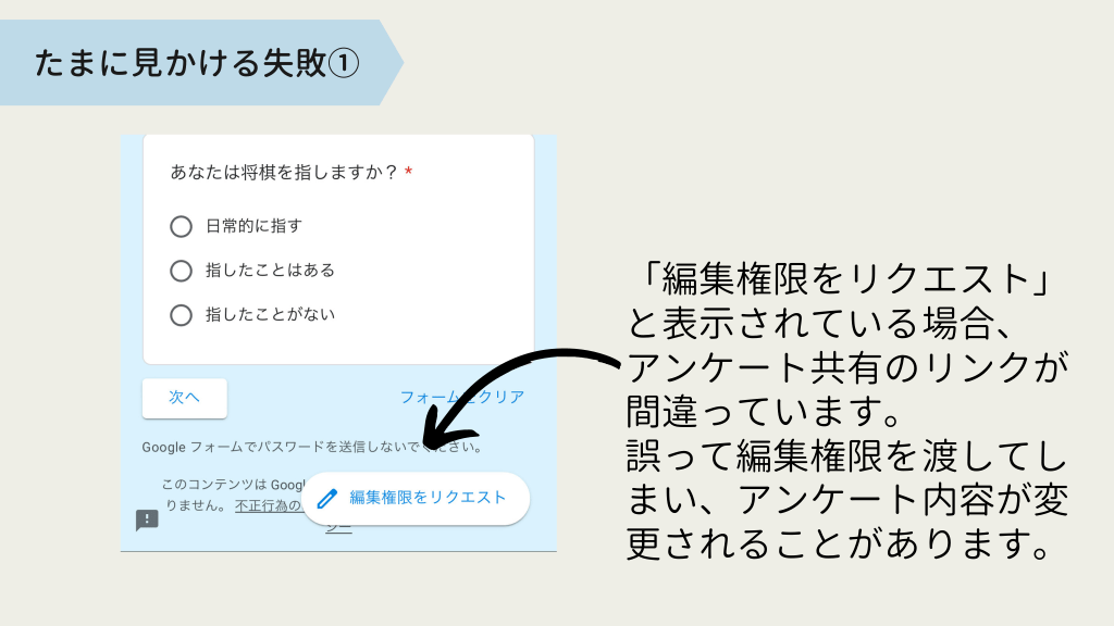 #12. たまに見かける失敗① 「編集権限をリクエスト」 と表示されている場合、 アンケート共有のリンクが 間違っています。 誤って編集権限を渡してし まい、アンケート内容が変 更されることがあります。