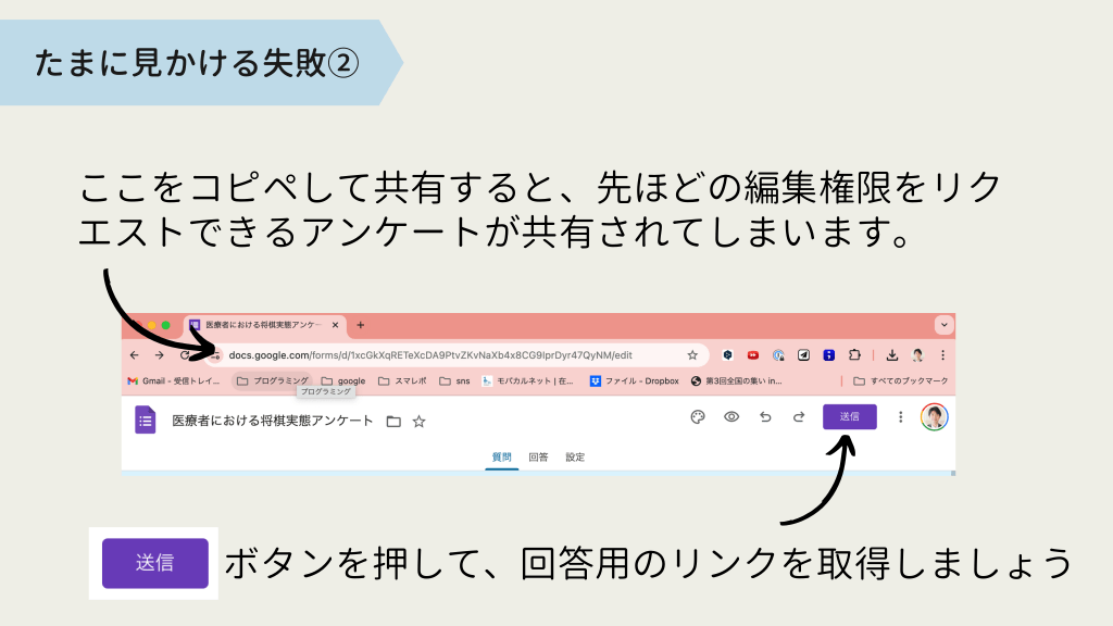 #13. たまに見かける失敗② ここをコピペして共有すると、先ほどの編集権限をリク エストできるアンケートが共有されてしまいます。 ボタンを押して、回答用のリンクを取得しましょう