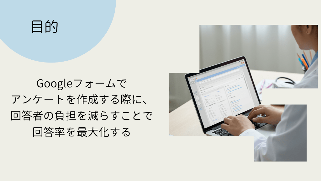 #2. 目的 Googleフォームで アンケートを作成する際に、 回答者の負担を減らすことで 回答率を最大化する