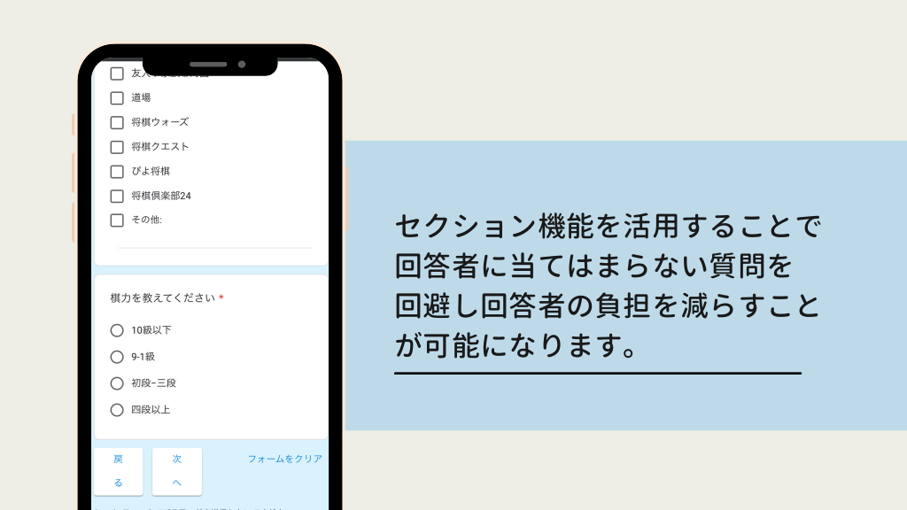 #5. セクション機能を活用することで 回答者に当てはまらない質問を 回避し回答者の負担を減らすこと が可能になります。