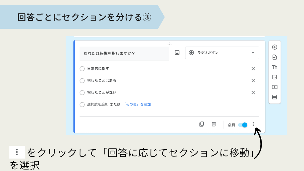 #8. 回答ごとにセクションを分ける③ をクリックして「回答に応じてセクションに移動」 を選択