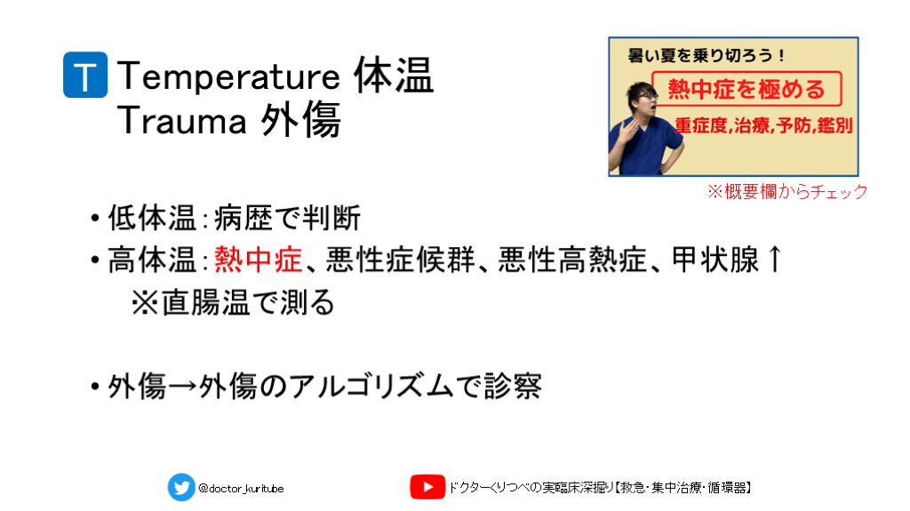 #13. Temperature 体温Trauma 外傷 T 低体温:病歴で判断