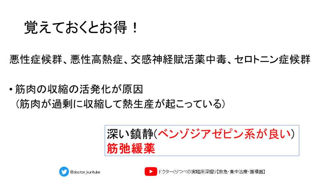 高体温:熱中症、悪性症候群、悪性高熱症、甲状腺↑