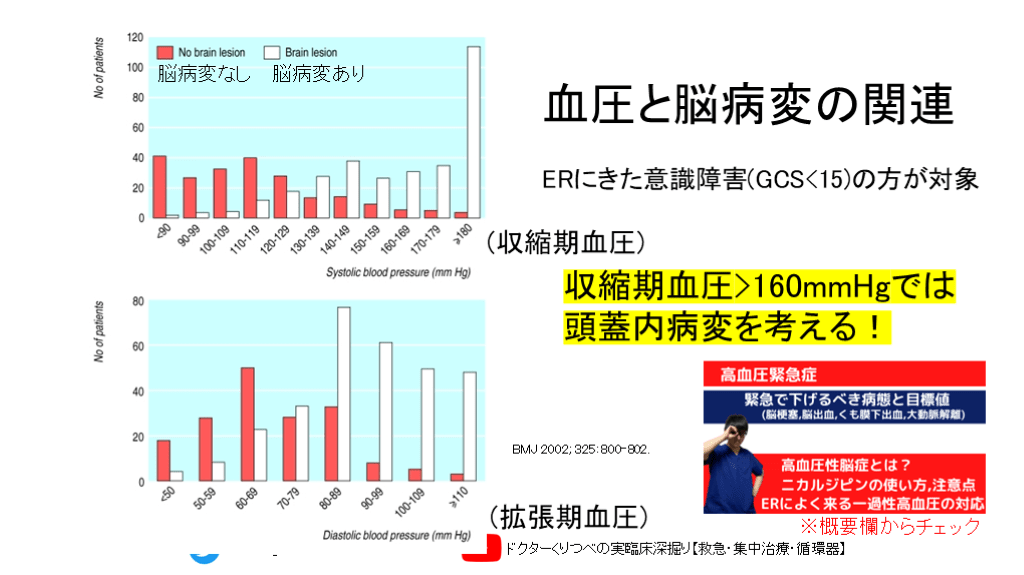 #20. 血圧と脳病変の関連 BMJ 2002; 325: 800–802. (収縮期血圧) (拡張期血圧) 脳病変あり 脳病変なし ERにきた意識障害(GCS<15)の方が対象 収縮期血圧>160mmHgでは