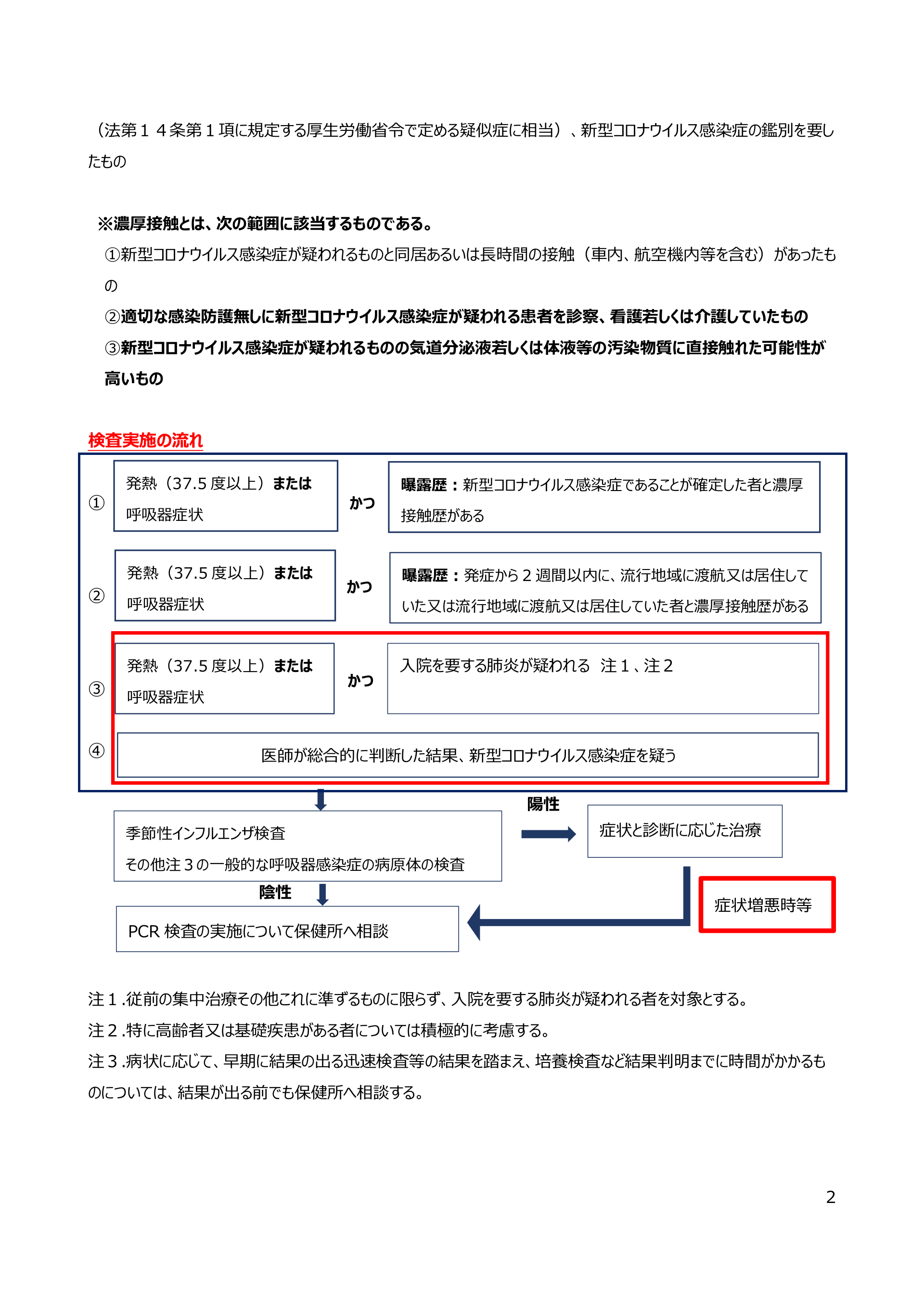 #2. (法第14条第1項に規定する厚生労働省令で定める疑似症に相当)、新型コロナウイルス感染症の鑑別を要し たもの ※濃厚接触とは、次の範囲に該当するものである。 ①新型コロナウイルス感染症が疑われるものと同居あるいは長時間の接触(車内、航空機内等を含む)があったも の ②適切な感染防護無しに新型コロナウイルス感染症が疑われる患者を診察、看護若しくは介護していたもの ③新型コロナウイルス感染症が疑われるものの気道分泌液若しくは体液等の汚染物質に直接触れた可能性が 高いもの 検査実施の流れ ① 発熱(37.5 度以上)または かつ 呼吸器症状 発熱(37.5 度以上)または ② 呼吸器症状 ④ 接触歴がある 曝露歴:発症から 2 週間以内に、流行地域に渡航又は居住して いた又は流行地域に渡航又は居住していた者と濃厚接触歴がある 発熱(37.5 度以上)または ③ かつ 曝露歴:新型コロナウイルス感染症であることが確定した者と濃厚 呼吸器症状 かつ 入院を要する肺炎が疑われる 注1、注2 医師が総合的に判断した結果、新型コロナウイルス感染症を疑う 陽性 季節性インフルエンザ検査 症状と診断に応じた治療 その他注3の一般的な呼吸器感染症の病原体の検査 陰性 症状増悪時等 PCR 検査の実施について保健所へ相談 注1.従前の集中治療その他これに準ずるものに限らず、入院を要する肺炎が疑われる者を対象とする。 注2.特に高齢者又は基礎疾患がある者については積極的に考慮する。 注3.病状に応じて、早期に結果の出る迅速検査等の結果を踏まえ、培養検査など結果判明までに時間がかかるも のについては、結果が出る前でも保健所へ相談する。 2