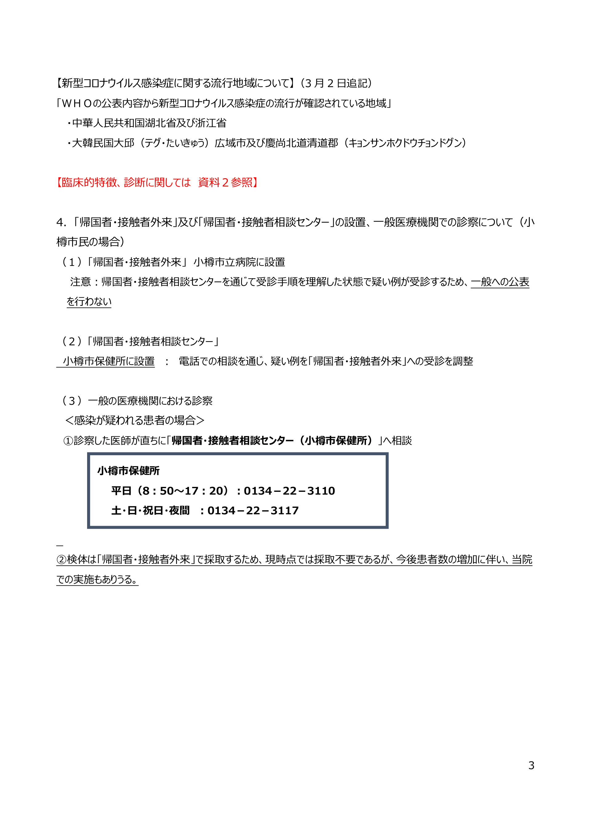 #3. 【新型コロナウイルス感染症に関する流行地域について】(3 月 2 日追記) 「WHOの公表内容から新型コロナウイルス感染症の流行が確認されている地域」 ・中華人民共和国湖北省及び浙江省 ・大韓民国大邱(テグ・たいきゅう)広域市及び慶尚北道清道郡(キョンサンホクドウチョンドグン) 【臨床的特徴、診断に関しては 資料2参照】 4.「帰国者・接触者外来」及び「帰国者・接触者相談センター」の設置、一般医療機関での診察について(小 樽市民の場合) (1)「帰国者・接触者外来」 小樽市立病院に設置 注意:帰国者・接触者相談センターを通じて受診手順を理解した状態で疑い例が受診するため、一般への公表 を行わない (2)「帰国者・接触者相談センター」 小樽市保健所に設置 : 電話での相談を通じ、疑い例を「帰国者・接触者外来」への受診を調整 (3)一般の医療機関における診察 <感染が疑われる患者の場合> ①診察した医師が直ちに「帰国者・接触者相談センター(小樽市保健所)」へ相談 小樽市保健所 平日(8:50~17:20):0134-22-3110 土・日・祝日・夜間 :0134-22-3117 ②検体は「帰国者・接触者外来」で採取するため、現時点では採取不要であるが、今後患者数の増加に伴い、当院 での実施もありうる。 3