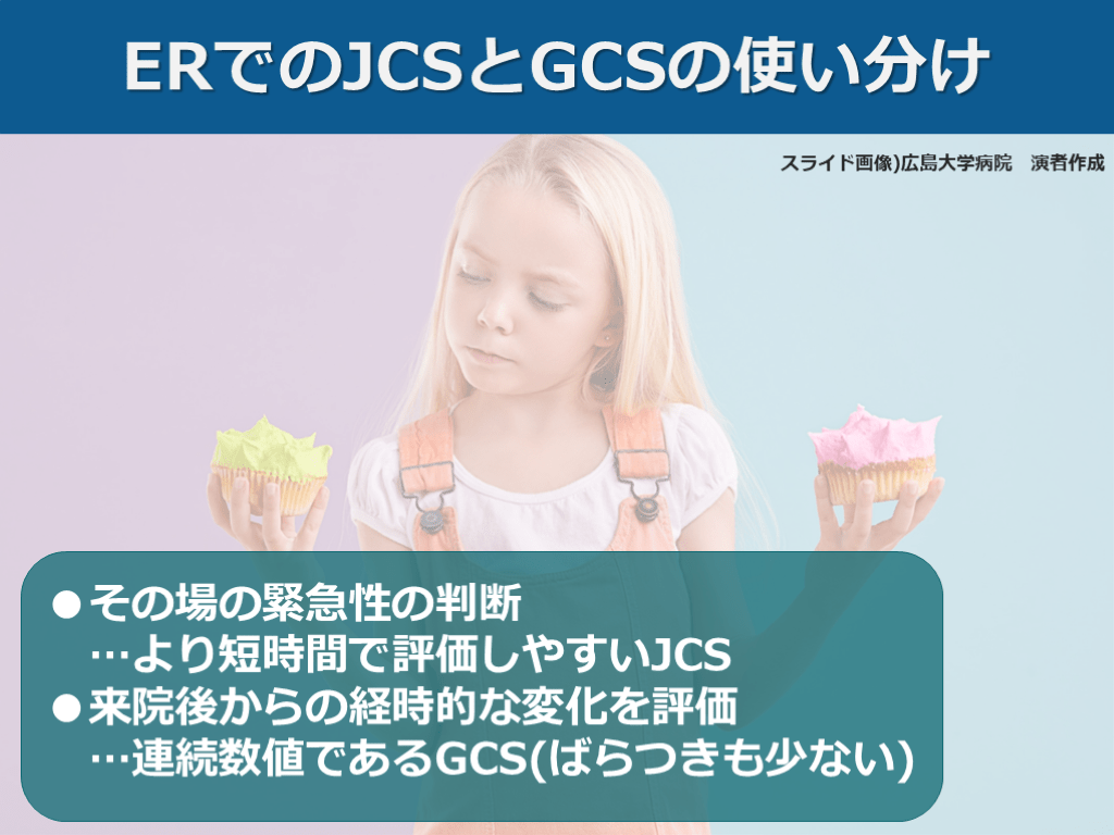 #12. ERでのJCSとGCSの使い分け スライド画像)広島大学病院 演者作成 ●その場の緊急性の判断
