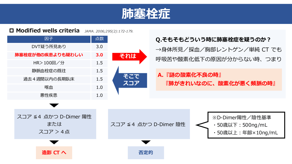 #10. 肺塞栓症 p Modified wells criteria JAMA. 2006;295(2):172-179. 因⼦ 点数 DVT疑う所⾒あり 3.0 肺塞栓症が他の疾患よりも疑わしい 3.0 HR>100回/分 1.5 静脈⾎栓症の既往 1.5 過去4週間以内の⻑期臥床 1.5 喀⾎ 1.0 悪性疾患 1.0 Q.そもそもどういう時に肺塞栓症を疑うのか︖ →⾝体所⾒/採⾎/胸部レントゲン/単純 CT でも それは 呼吸苦や酸素化低下の原因が分からない時、つまり そこで スコア A.『謎の酸素化不良の時』 『肺がきれいなのに、酸素化が悪く頻脈の時』 スコア ≦4 点かつ D-Dimer 陽性 または スコア ≦4 点かつ D-Dimer 陰性 スコア >4点 造影 CT へ ※D-Dimer陽性/陰性基準 ・50歳以下︓500ng/mL ・50歳以上︓年齢×10ng/mL 否定的