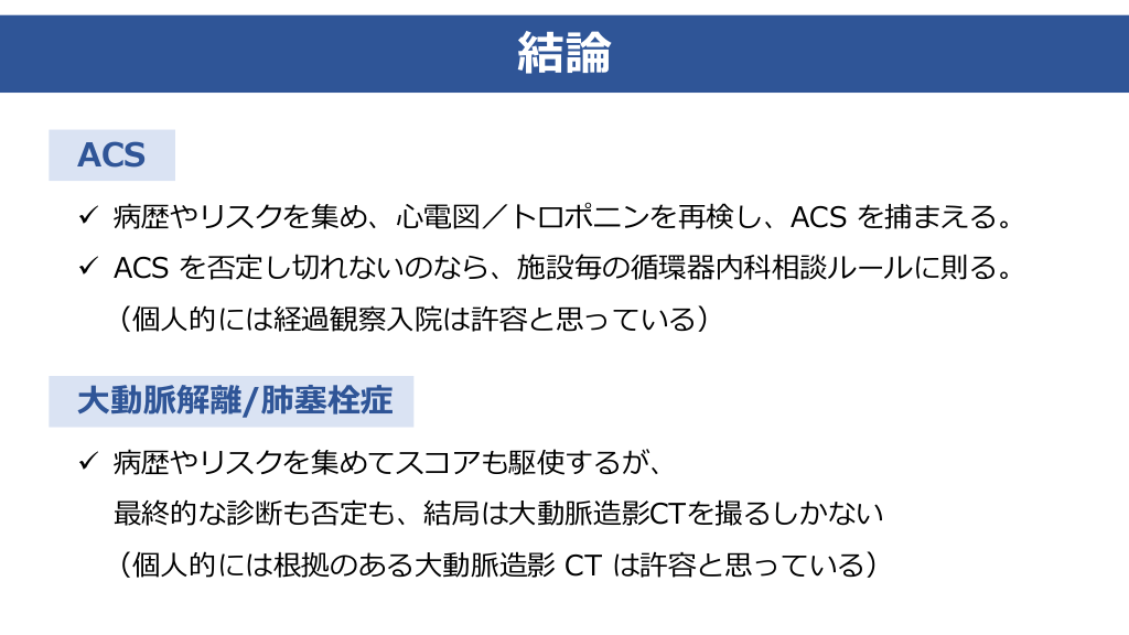 #11. 結論 ACS ü 病歴やリスクを集め、⼼電図/トロポニンを再検し、ACS を捕まえる。 ü ACS を否定し切れないのなら、施設毎の循環器内科相談ルールに則る。 (個⼈的には経過観察⼊院は許容と思っている) ⼤動脈解離/肺塞栓症 ü 病歴やリスクを集めてスコアも駆使するが、 最終的な診断も否定も、結局は⼤動脈造影CTを撮るしかない (個⼈的には根拠のある⼤動脈造影 CT は許容と思っている)