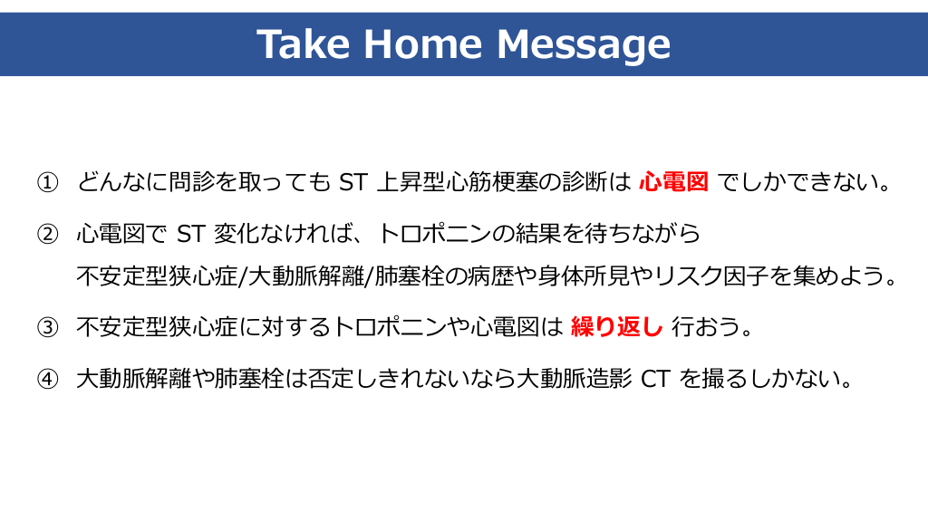 #2. Take Home Message ① どんなに問診を取っても ST 上昇型⼼筋梗塞の診断は ⼼電図 でしかできない。 ② ⼼電図で ST 変化なければ、トロポニンの結果を待ちながら 不安定型狭⼼症/⼤動脈解離/肺塞栓の病歴や⾝体所⾒やリスク因⼦を集めよう。 ③ 不安定型狭⼼症に対するトロポニンや⼼電図は 繰り返し ⾏おう。 ④ ⼤動脈解離や肺塞栓は否定しきれないなら⼤動脈造影 CT を撮るしかない。