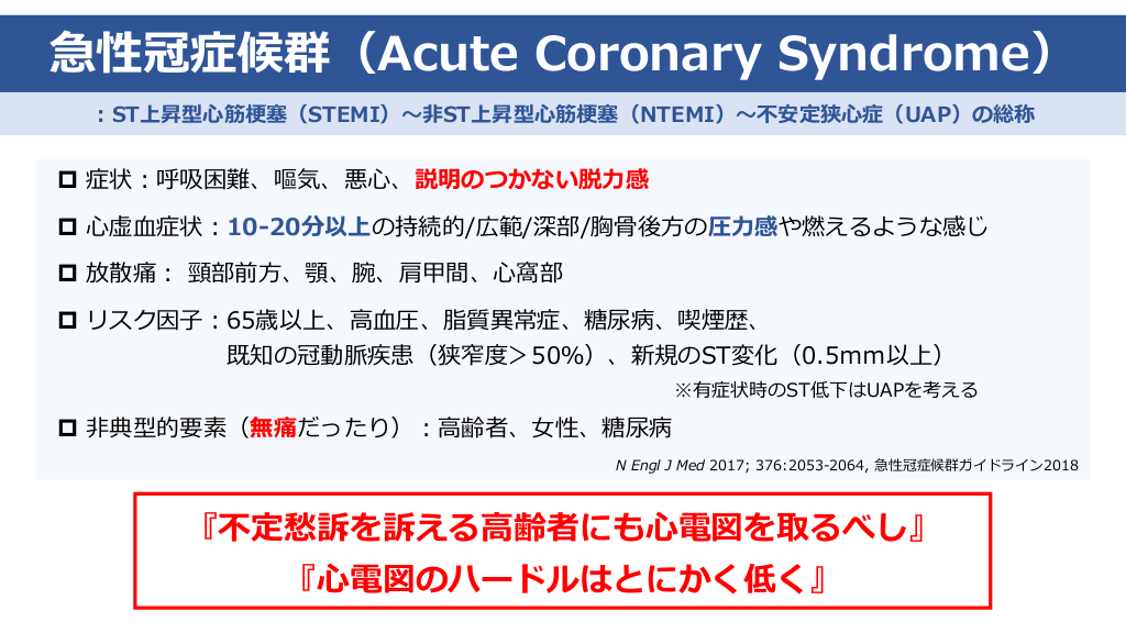 #4. 急性冠症候群(Acute Coronary Syndrome) ︓ST上昇型⼼筋梗塞(STEMI)〜⾮ST上昇型⼼筋梗塞(NTEMI)〜不安定狭⼼症(UAP)の総称 p 症状︓呼吸困難、嘔気、悪⼼、説明のつかない脱⼒感 p ⼼虚⾎症状︓10-20分以上の持続的/広範/深部/胸⾻後⽅の圧⼒感や燃えるような感じ p 放散痛︓ 頸部前⽅、顎、腕、肩甲間、⼼窩部 p リスク因⼦︓65歳以上、⾼⾎圧、脂質異常症、糖尿病、喫煙歴、 既知の冠動脈疾患(狭窄度>50%)、新規のST変化(0.5mm以上) ※有症状時のST低下はUAPを考える p ⾮典型的要素(無痛だったり)︓⾼齢者、⼥性、糖尿病 N Engl J Med 2017; 376:2053-2064, 急性冠症候群ガイドライン2018 『不定愁訴を訴える⾼齢者にも⼼電図を取るべし』 『⼼電図のハードルはとにかく低く』