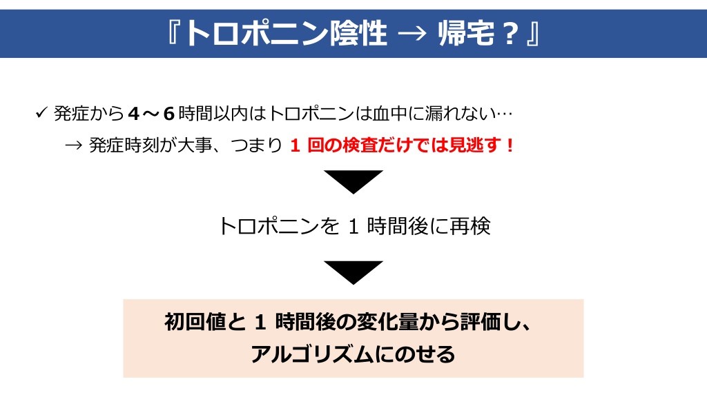 #5. 『トロポニン陰性 → 帰宅︖』 ü 発症から4〜6時間以内はトロポニンは⾎中に漏れない… → 発症時刻が⼤事、つまり 1 回の検査だけでは⾒逃す︕ トロポニンを 1 時間後に再検 初回値と 1 時間後の変化量から評価し、 アルゴリズムにのせる