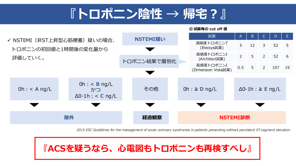 #6. 『トロポニン陰性 → 帰宅︖』 p 試薬毎の cut off 値 ü NSTEMI(⾮ST上昇型⼼筋梗塞)疑いの場合、 NSTEMI疑い トロポニンの初回値と1時間後の変化量から 評価していく。 トロポニン結果で層別化 0h︓< B ng/L かつ Δ0-1h︓< C ng/L 0h︓< A ng/L 除外 その他 経過観察 試薬 A B C D E ⾼感度トロポニンT (Elecsys試薬) 5 12 3 52 5 ⾼感度トロポニンI (Architect試薬) 2 5 2 52 6 ⾼感度トロポニンI (Dimension Vista試薬) 0.5 5 2 107 19 0h︓≧ D ng/L Δ0-1h︓≧ E ng/L NSTEMI診断 2015 ESC Guidelines for the management of acute coronary syndromes in patients presenting without persistent ST-segment elevation 『ACSを疑うなら、⼼電図もトロポニンも再検すべし』