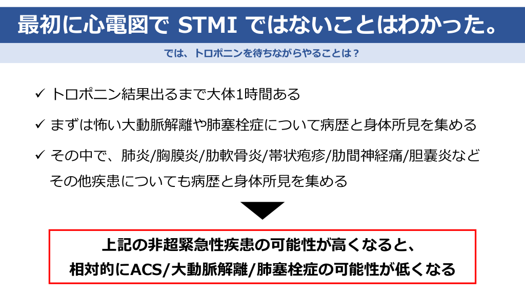 #7. 最初に⼼電図で STMI ではないことはわかった。 では、トロポニンを待ちながらやることは︖ ü トロポニン結果出るまで⼤体1時間ある ü まずは怖い⼤動脈解離や肺塞栓症について病歴と⾝体所⾒を集める ü その中で、肺炎/胸膜炎/肋軟⾻炎/帯状疱疹/肋間神経痛/胆嚢炎など その他疾患についても病歴と⾝体所⾒を集める 上記の⾮超緊急性疾患の可能性が⾼くなると、 相対的にACS/⼤動脈解離/肺塞栓症の可能性が低くなる