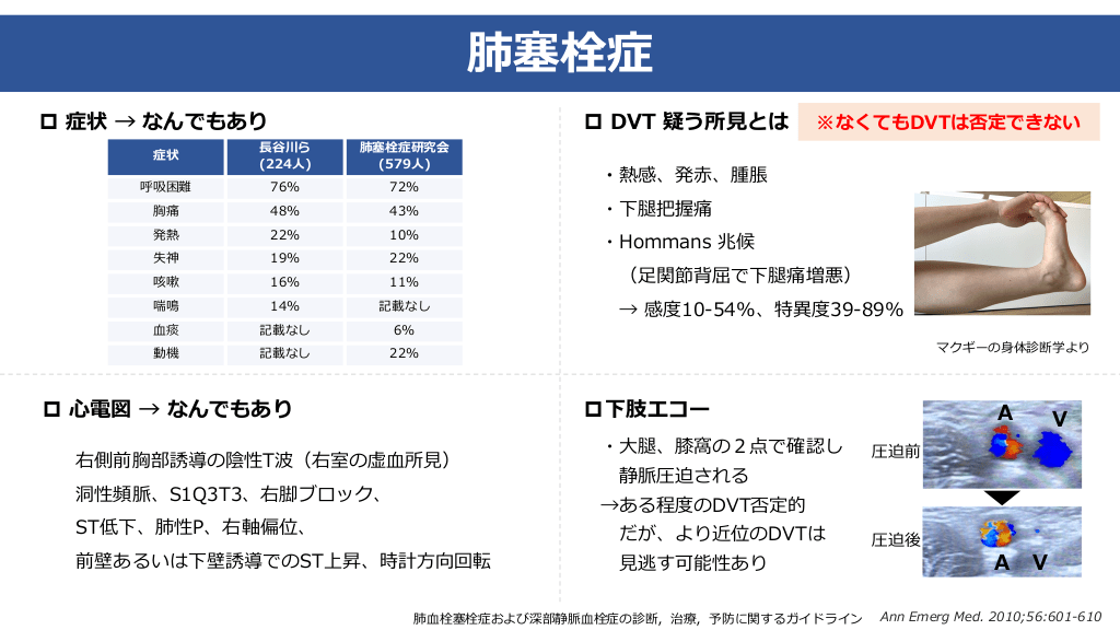 #9. 肺塞栓症 p 症状 → なんでもあり p DVT 疑う所⾒とは 症状 ⻑⾕川ら (224⼈) 肺塞栓症研究会 (579⼈) 呼吸困難 76% 72% 胸痛 48% 43% ・下腿把握痛 発熱 22% 10% 失神 19% 22% ・Hommans 兆候 咳嗽 16% 11% 喘鳴 14% 記載なし ⾎痰 記載なし 6% 動機 記載なし 22% p ⼼電図 → なんでもあり ※なくてもDVTは否定できない ・熱感、発⾚、腫脹 (⾜関節背屈で下腿痛増悪) → 感度10-54%、特異度39-89% マクギーの⾝体診断学より p 下肢エコー 右側前胸部誘導の陰性T波(右室の虚⾎所⾒) 洞性頻脈、S1Q3T3、右脚ブロック、 ・⼤腿、膝窩の2点で確認し 静脈圧迫される A V 圧迫前 →ある程度のDVT否定的 ST低下、肺性P、右軸偏位、 前壁あるいは下壁誘導でのST上昇、時計⽅向回転 だが、より近位のDVTは ⾒逃す可能性あり 肺⾎栓塞栓症および深部静脈⾎栓症の診断,治療,予防に関するガイドライン 圧迫後 A V Ann Emerg Med. 2010;56:601-610
