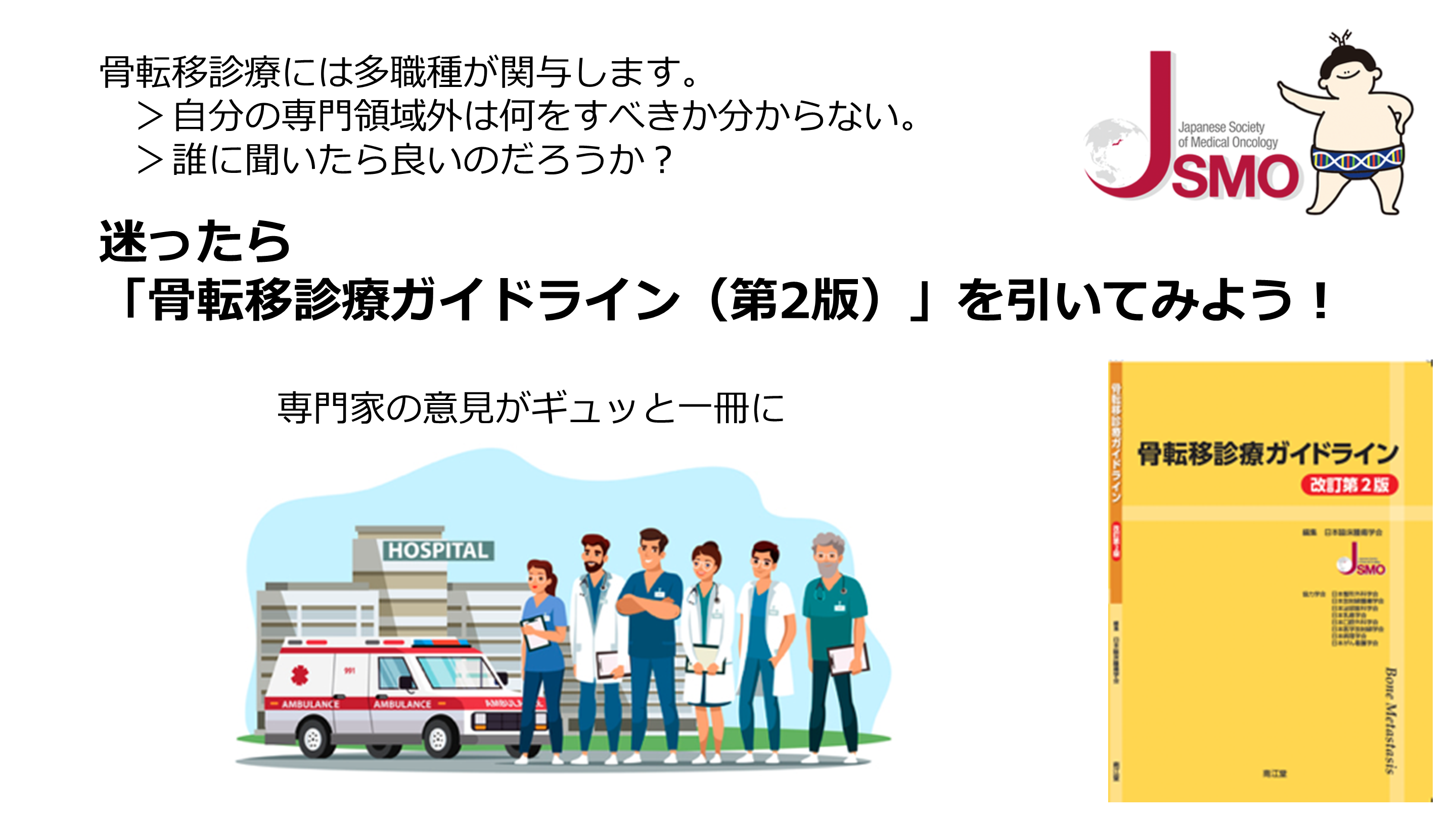 骨転移診療の全体像を解説した広報用スライドです。脊髄横断麻痺などの緊急事態への対応や、多職種連携の重要性を整理。骨修飾薬の作用機序や治療の選択肢をイラストで平易に示し、ガイドラインの活用を促します。