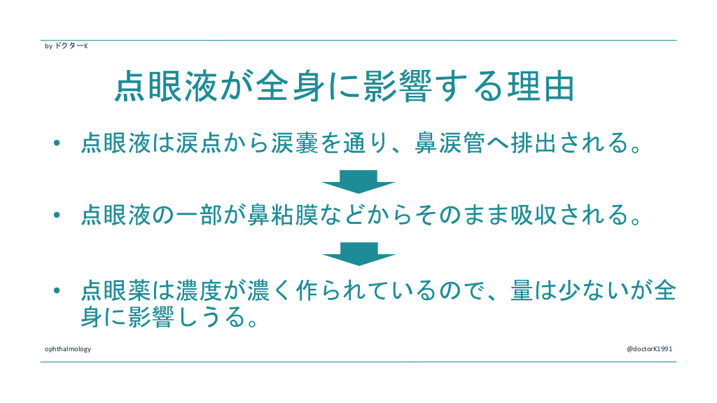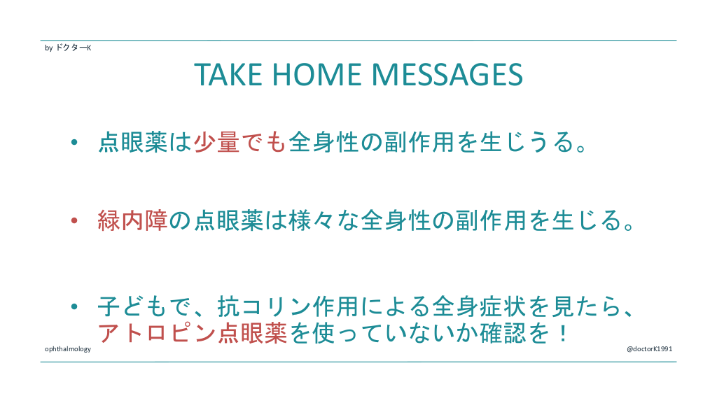 点眼薬は少量でも全身性の副作用を生じ得ます。このスライドでは、使用頻度の高い緑内障の点眼薬とアロトピン点眼薬の副作用についてまとめました。