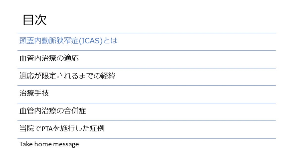 井上 智弘;頭蓋内血管狭窄病変の手術治療の可能性(動脈硬化性病変) Jpn J Neurosurg(Tokyo)29:709‒715, 2020 右中大脳動脈(M1)狭窄 左内頚動脈(C4)狭窄 右椎骨動脈狭窄 頭蓋内動脈狭窄症(ICAS)とは