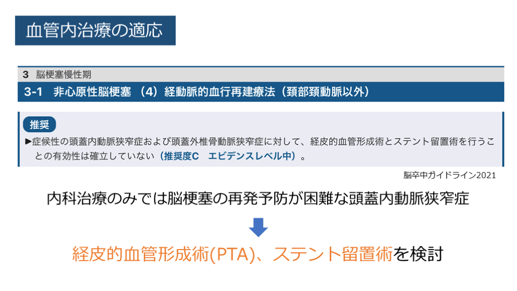 #6. 脳卒中ガイドライン2021 血管内治療の適応 内科治療のみでは脳梗塞の再発予防が困難な頭蓋内動脈狭窄症 経皮的血管形成術(PTA)、ステント留置術を検討