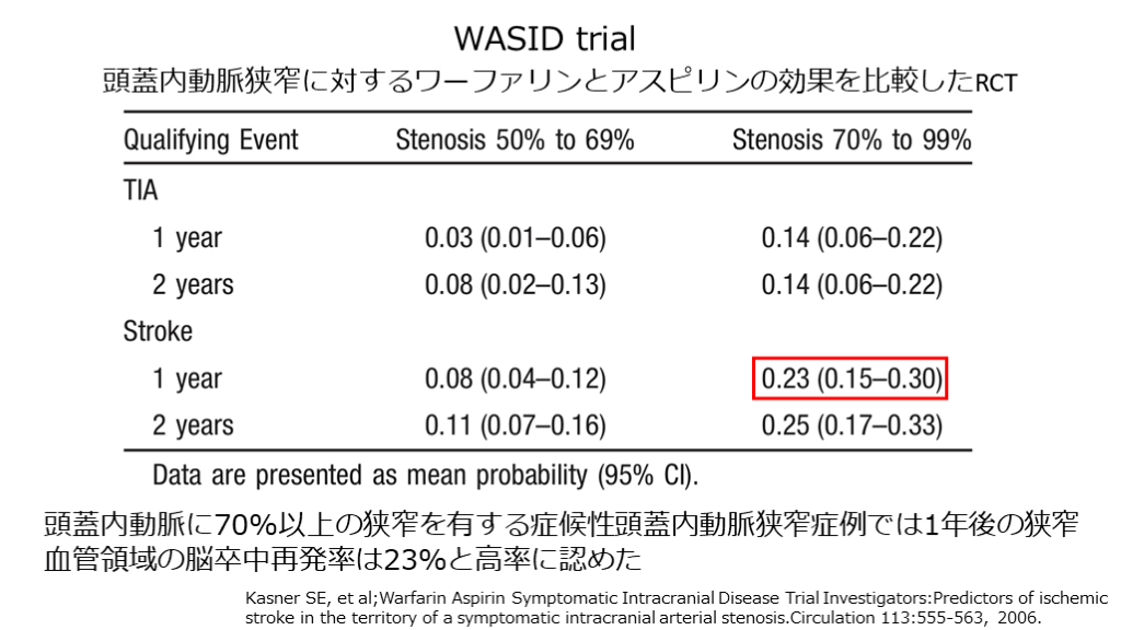 #8. Kasner SE, et al;Warfarin Aspirin Symptomatic Intracranial Disease Trial Investigators:Predictors of ischemic stroke in the territory of a symptomatic intracranial arterial stenosis.Circulation 113:555‒563, 2006. 頭蓋内動脈に70%以上の狭窄を有する症候性頭蓋内動脈狭窄症例では1年後の狭窄血管領域の脳卒中再発率は23%と高率に認めた 頭蓋内動脈狭窄に対するワーファリンとアスピリンの効果を比較したRCT WASID trial