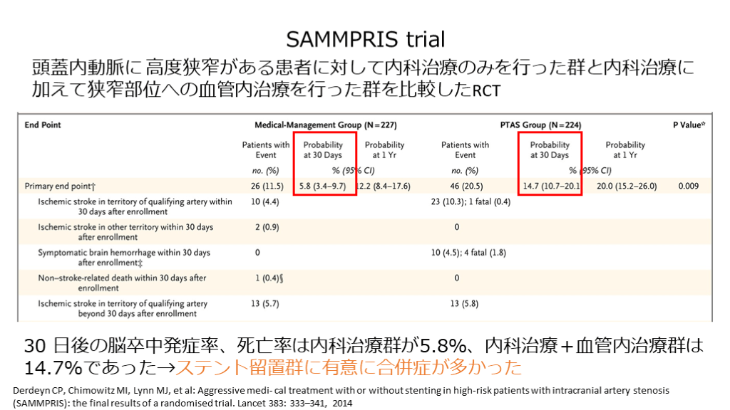 #12. SAMMPRIS trial Derdeyn CP, Chimowitz MI, Lynn MJ, et al: Aggressive medi- cal treatment with or without stenting in high-risk patients with intracranial artery stenosis (SAMMPRIS): the final results of a randomised trial. Lancet 383: 333–341, 2014 30 日後の脳卒中発症率、死亡率は内科治療群が5.8%、内科治療+血管内治療群は14.7%であった→ステント留置群に有意に合併症が多かった 頭蓋内動脈に 高度狭窄がある患者に対して内科治療のみを行った群と内科治療に加えて狭窄部位への血管内治療を行った群を比較したRCT