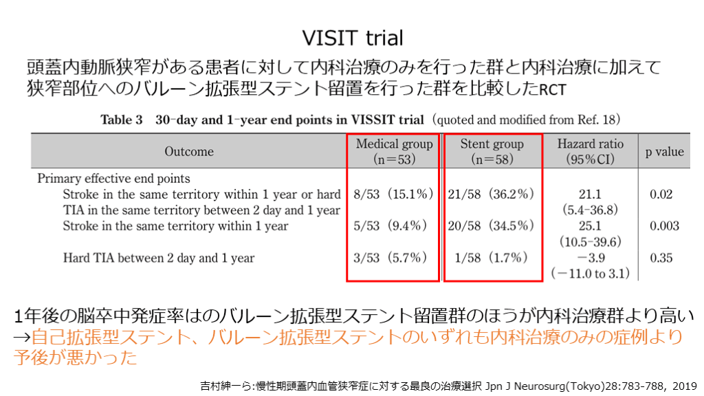 #14. VISIT trial 頭蓋内動脈狭窄がある患者に対して内科治療のみを行った群と内科治療に加えて狭窄部位へのバルーン拡張型ステント留置を行った群を比較したRCT 吉村紳一ら:慢性期頭蓋内血管狭窄症に対する最良の治療選択 Jpn J Neurosurg(Tokyo)28:783‒788, 2019 1年後の脳卒中発症率はのバルーン拡張型ステント留置群のほうが内科治療群より高い