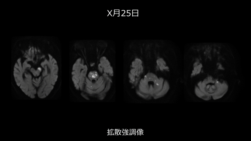 X月25日 左顔面神経麻痺、右上下肢麻痺、左下肢麻痺