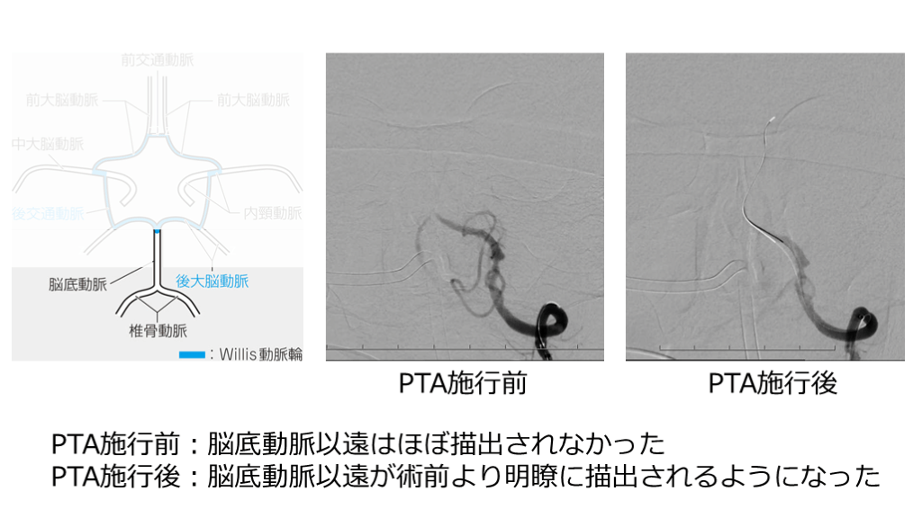 PTA施行後:脳底動脈以遠が術前より明瞭に描出されるようになった PTA施行後