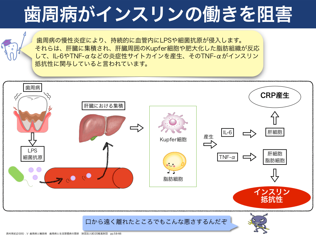 #10. 歯周病がインスリンの働きを阻害 歯周病の慢性炎症により、持続的に血管内にLPSや細菌抗原が侵入します。 それらは、肝臓に集積され、肝臓周囲のKupfer細胞や肥大化した脂肪組織が反応 して、IL-6やTNF-αなどの炎症性サイトカインを産生、そのTNF-αがインスリン 抵抗性に関与していると言われています。  歯周病  CRP産生 肝臓における集積  Kupfer細胞 LPS 細菌抗原  産生  IL-6  肝細胞  TNF-α  肝細胞 脂肪細胞  脂肪細胞  インスリン 抵抗性 口から遠く離れたところでもこんな悪さするんだぞ 西村英紀(2005).Ⅴ 歯周病と糖尿病  歯周病と生活習慣病の関係  財団法人8020推進財団  pp.58-66
