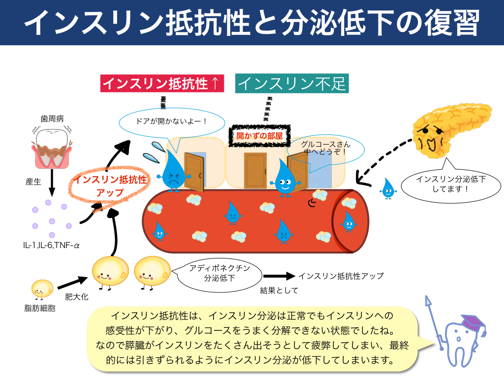 #11. インスリン抵抗性と分泌低下の復習 インスリン抵抗性↑ 歯周病  インスリン不足  ドアが開かないよー!  開かずの部屋 グルコースさん 中へどうぞ!  産生  インスリン抵抗性 アップ  インスリン分泌低下 してます!  IL-1,IL-6,TNF-α アディポネクチン 分泌低下 肥大化 脂肪細胞  インスリン抵抗性アップ 結果として  インスリン抵抗性は、インスリン分泌は正常でもインスリンへの 感受性が下がり、グルコースをうまく分解できない状態でしたね。 なので膵臓がインスリンをたくさん出そうとして疲弊してしまい、最終 的には引きずられるようにインスリン分泌が低下してしまいます。