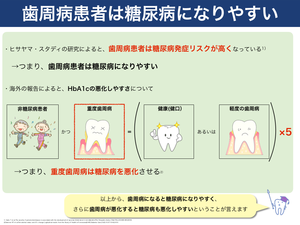 #12. 歯周病患者は糖尿病になりやすい ・ヒサヤマ・スタディの研究によると、歯周病患者は糖尿病発症リスクが高くなっている1)  →つまり、歯周病患者は糖尿病になりやすい ・海外の報告によると、HbA1cの悪化しやすさについて  健康(健口)  重度歯周病  非糖尿病患者  かつ  =  軽度の歯周病  あるいは  →つまり、重度歯周病は糖尿病を悪化させる  2)  以上から、歯周病になると糖尿病になりやすく、 さらに歯周病が悪化すると糖尿病も悪化しやすいということが言えます 1)Saito T et al.:The severity if periodontal disease is associated with the development of glucose intolerance in non-diabetics:The Hisayama study.J Dent Pes.,83:485-490,2004. 2)Demmer RT et al.:Periodontal status and A1c change.Logitudinal results from the Study of Health in Pomerania(SHIP).Diabetes Care,33(5):1037-1043,2010.  5